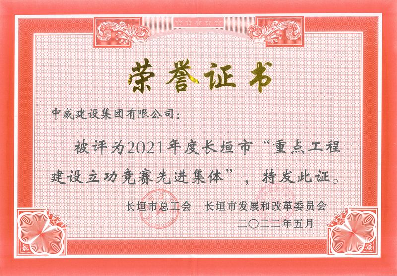 在長垣市總工會、長垣市發(fā)展和改革委員會組織的2021年全市重點工程建設項目開展的“比工程質(zhì)量、比安全生產(chǎn)、比建設進度、比技術創(chuàng)新、比科學管理、比文明施工、創(chuàng)和諧團隊”為主要內(nèi)容的“六比一創(chuàng)”立功競賽活動中,中威集團榮獲2021年度長垣市“重點工程建設立功競賽先進集體”榮譽稱號。