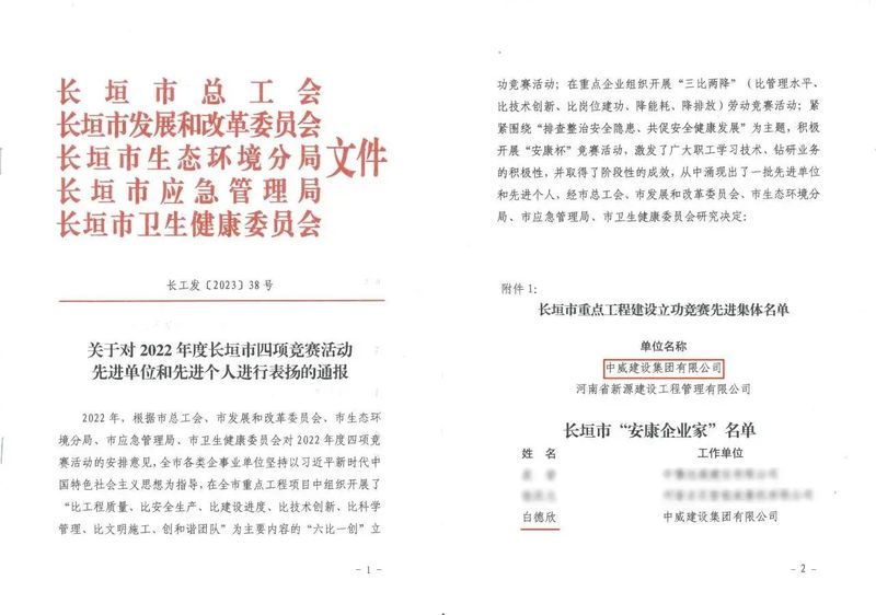 近日,由長(zhǎng)垣市總工會(huì)、長(zhǎng)垣市發(fā)改委、長(zhǎng)垣市衛(wèi)健委、長(zhǎng)垣市應(yīng)急管理局、長(zhǎng)垣市生態(tài)環(huán)境分局聯(lián)合舉辦的2022年度全市重點(diǎn)工程建設(shè)項(xiàng)目“六比一創(chuàng)”立功競(jìng)賽活動(dòng)結(jié)果出爐,中威集團(tuán)憑借優(yōu)異的成績(jī)?cè)俅螛s獲了“重點(diǎn)工程建設(shè)立功競(jìng)賽先進(jìn)集體”榮譽(yù)稱(chēng)號(hào),集團(tuán)董事長(zhǎng)白德欣被授予“安康杯企業(yè)家”榮譽(yù)稱(chēng)號(hào)。