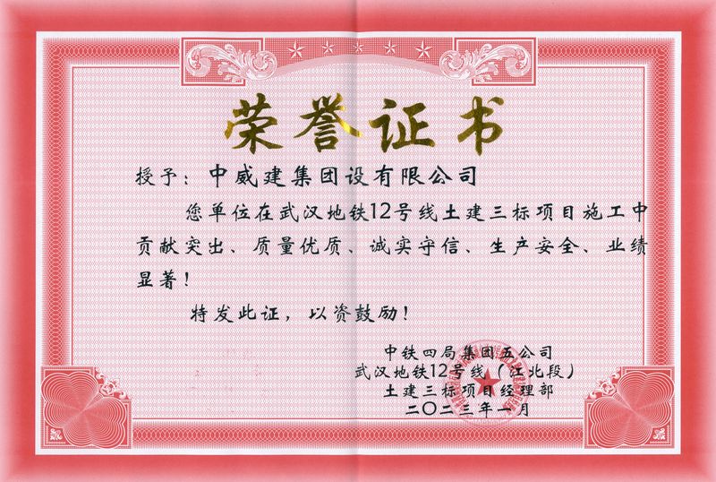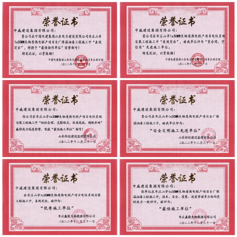 年末歲尾,喜報(bào)頻至。在公司領(lǐng)導(dǎo)的正確指引下,中威集團(tuán)所承建的多個(gè)項(xiàng)目得到了業(yè)主、監(jiān)理、總包的充分認(rèn)可,各項(xiàng)榮譽(yù)紛至沓來(lái)。集團(tuán)所承接的武漢地鐵12號(hào)線土建三標(biāo)項(xiàng)目在施工中貢獻(xiàn)突出、質(zhì)量?jī)?yōu)質(zhì)、誠(chéng)實(shí)守信、生產(chǎn)安全、業(yè)績(jī)顯著,獲得項(xiàng)目部通報(bào)表?yè)P(yáng);佘兵凱經(jīng)理在武漢地鐵12號(hào)線土建三標(biāo)項(xiàng)目施工中表現(xiàn)突出,被評(píng)為優(yōu)秀項(xiàng)目經(jīng)理。集團(tuán)所承接的山東棗莊山亭1×30MW生物質(zhì)熱電聯(lián)產(chǎn)項(xiàng)目全廠保溫油漆工程和電儀系統(tǒng)安裝工程在項(xiàng)目經(jīng)理高隨省的帶領(lǐng)下也是成績(jī)斐然,中威集團(tuán)被業(yè)主棗莊鑫能生物能源有限公司、監(jiān)理方山東恒信建設(shè)監(jiān)理有限公司、總包方中國(guó)電建集團(tuán)山東電力建設(shè)有限公司棗莊項(xiàng)目部授予“優(yōu)秀施工單位”、“最佳施工單位”、“安全文明施工先進(jìn)單位”、“最佳協(xié)作單位”、“重合同守信用先進(jìn)施工單位”等榮譽(yù)稱號(hào)。
